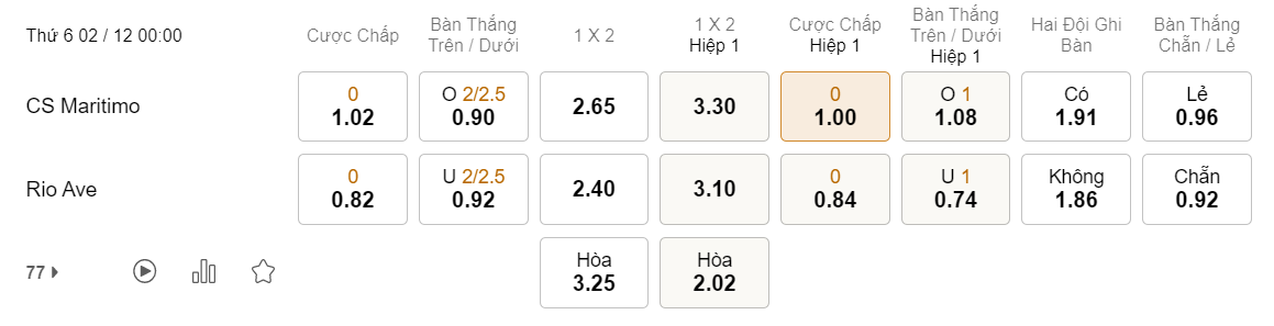 Tỉ lệ kèo Maritimo vs Rio Ave