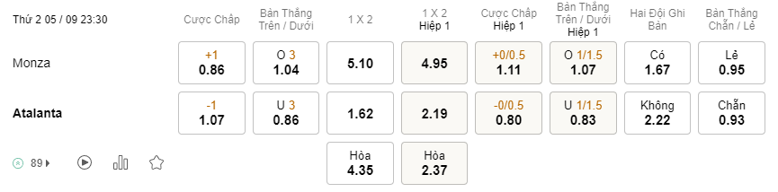 Soi kèo châu Á Monza vs Atalanta: 0.86*1*1.07