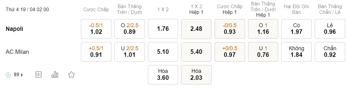 Soi kèo tài xỉu Napoli vs Milan: 0.89*2/2.5*1.01