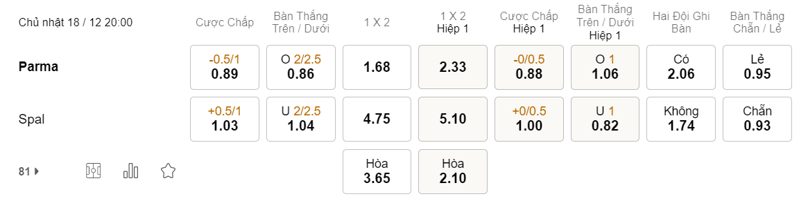 Soi kèo hiệp 1 Parma vs SPAL: 0.88*0/0.5*1.00