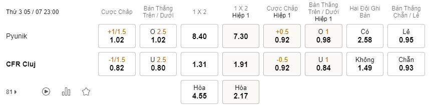 Soi kèo châu Á Pyunik vs CFR Cluj: 1.02*1/1.5*0.82