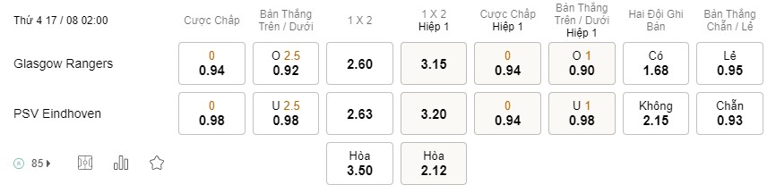 Soi kèo hiệp 1 Rangers vs PSV: 0.94*0*0.94