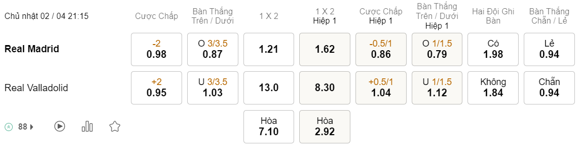 Tỉ lệ kèo Real Madrid vs Valladolid