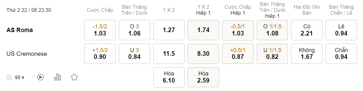 Tỉ lệ kèo Roma vs Cremonese