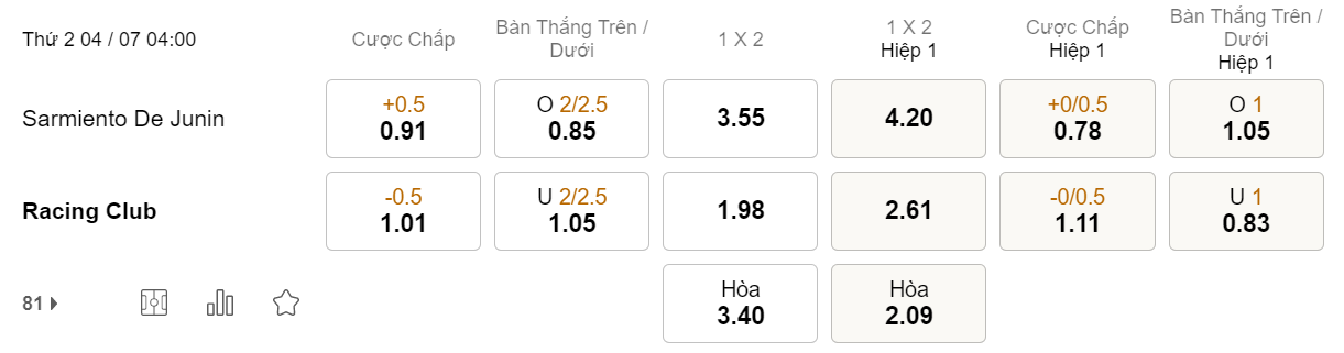 Tỉ lệ kèo Sarmiento vs Racing Club