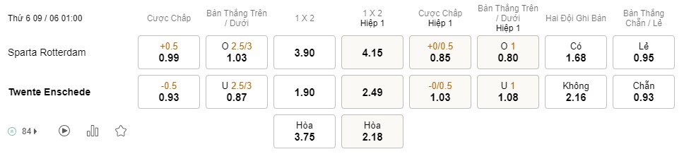 Soi kèo hiệp 1 Sparta Rotterdam vs Twente: 0.85*0/0.5*1.03