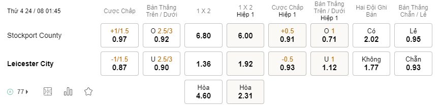 Tỉ lệ kèo Stockport vs Leicester