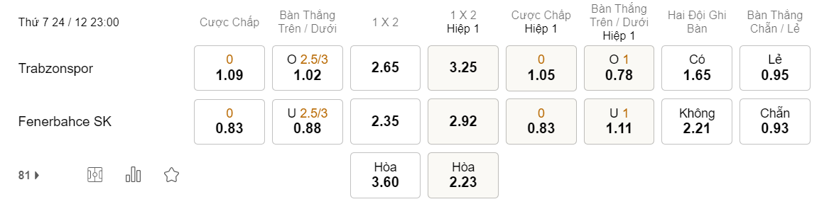Soi kèo hiệp 1 Trabzonspor vs Fenerbahce: 1.05*0*0.83