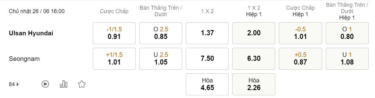 Soi kèo hiệp 1 Ulsan Hyundai vs Seongnam: 1.01*0.5*0.87