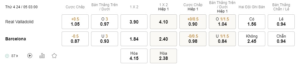 Soi kèo châu Á Valladolid vs Barcelona: 1.05*0.5*0.87
