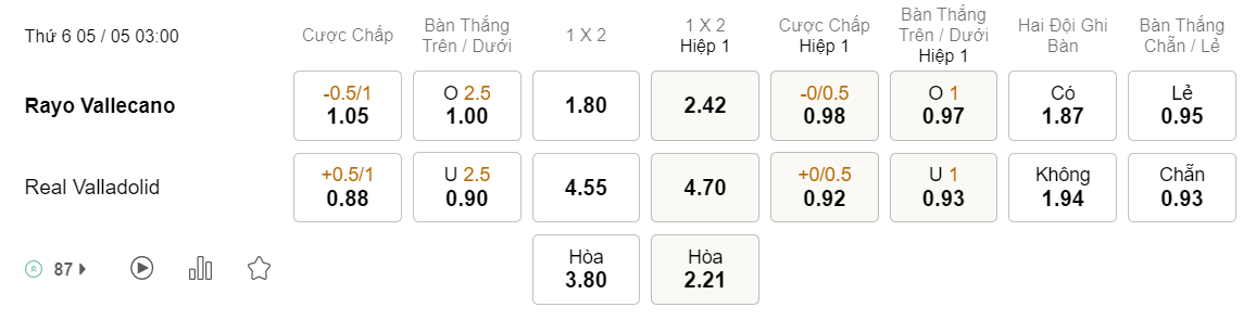 Soi kèo châu Á Vallecano vs Valladolid: 1.05*0.5/1*0.88