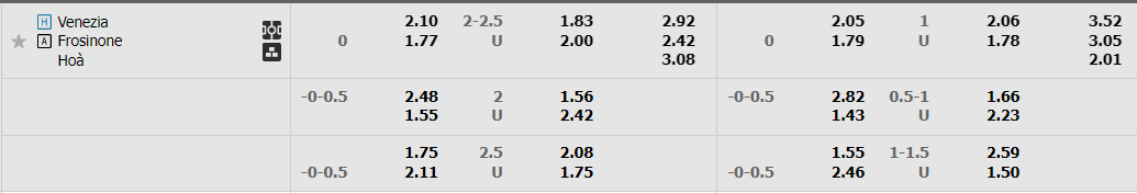 Frosinone đang là cửa đặt chiếm được sự tin tưởng của các bet thủ trong thời gian gần đây, minh chứng là, với 60% tỷ lệ thắng kèo sau 5 trận gần nhất. Trong khi đó, Venezia lại cho thấy sự khó khăn trong việc giành chiến thắng tại kèo handicap, với việc họ chỉ giành 1 chiến thắng sau 5 trận kèo gần nhất. Với tỷ lệ kèo đồng banh, các chuyên gia đang đánh giá, Frosinone sẽ là lựa chọn hợp lý trong trận này.