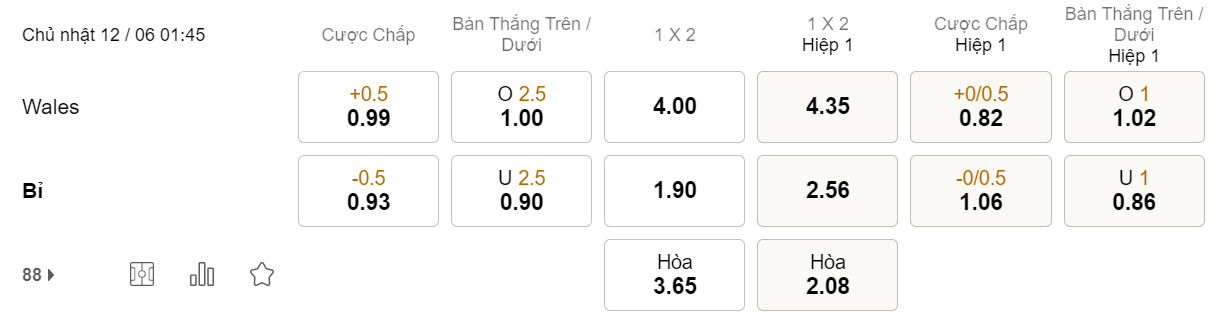 Tỉ lệ kèo Wales vs Bỉ